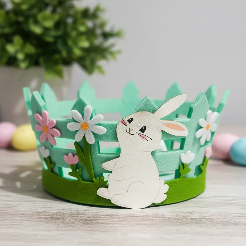 Celebre a Páscoa com charme e alegria com a Cestinha de Páscoa Decorativa em Feltro. Ideal para acomodar ovos de chocolate, doces e lembrancinhas, ela é perfeita para compor a decoração da sua casa ou festas temáticas.