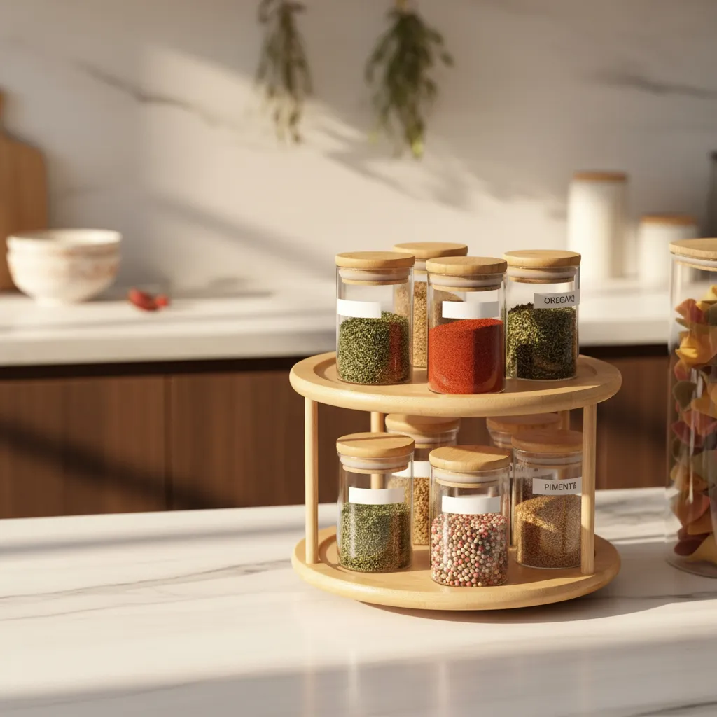 Organize e sirva com praticidade e elegância com esta bandeja giratória de bambu com dois andares. Ideal para servir petiscos, temperos, frios, doces ou utilizar como organizador em cozinhas, mesas e bancadas. Fabricada em bambu natural, é resistente, sustentável e traz um toque sofisticado ao ambiente.